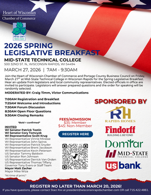 $35 member Join the Heart of Wisconsin Chamber of Commerce on Friday, March 27th at Mid-State Technical College in Wisconsin Rapids for a Spring Legislative Breakfast.
